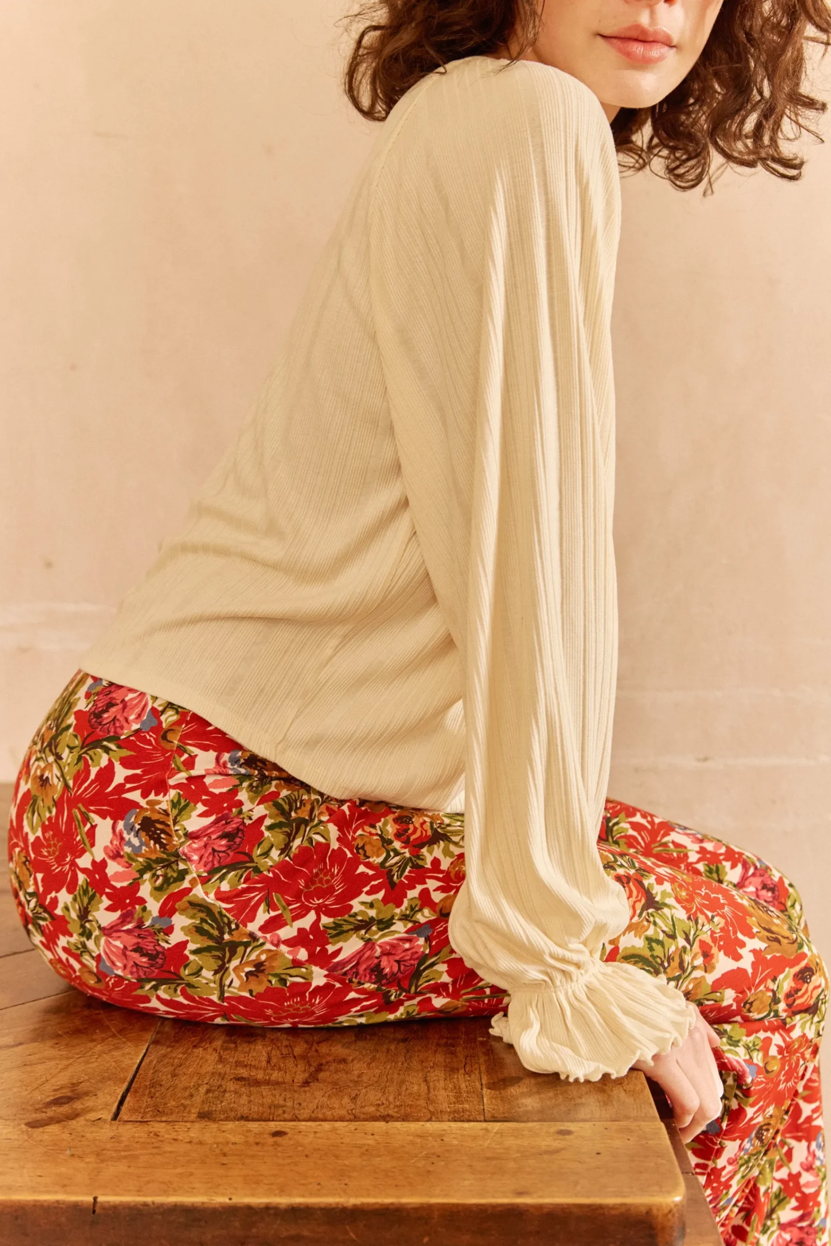 - Des manches généreuses avec des fronces épaules et un poignet élastiqué qui vient créer du blousant et un effet volanté