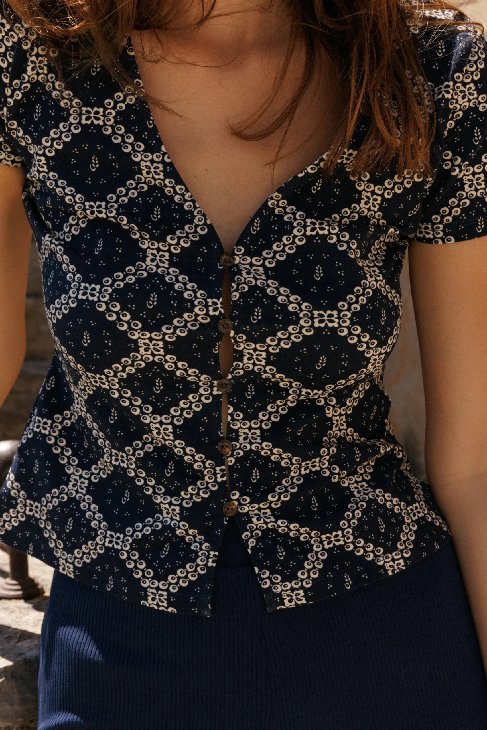 - Une jolie encolure en V et une patte de boutonnage,