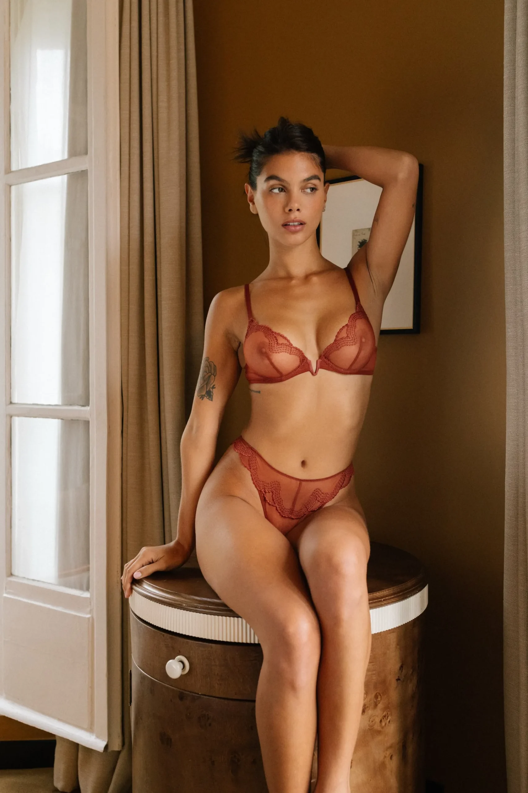 Une transparence toujours aussi impertinente, les mêmes broderies vertigineuses et forme fatale dans un nouveau coloris qui vient réveiller cet iconique qu’est le triangle armaturé Elu de mon cœur.