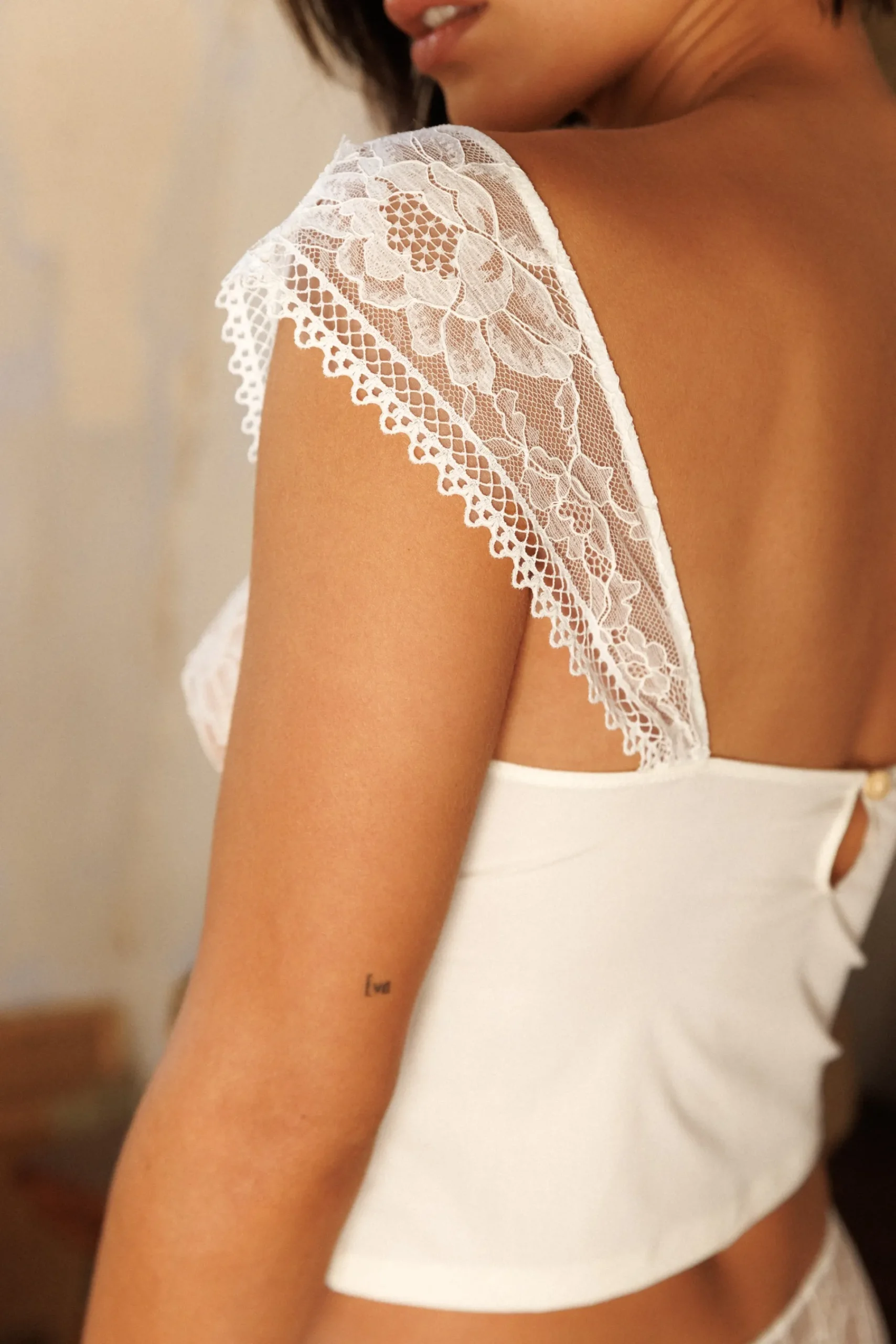 - Des petites manches fines en dentelle qui couvrent à peine les épaules